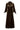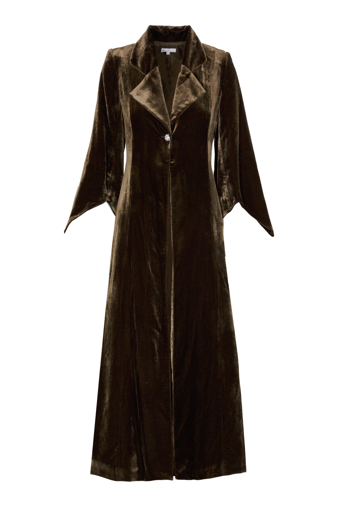Abrigo largo confeccionado en terciopelo color topo con mucha caída. El diseño lleva solapas y mangas en pico. Va armado con hombreras y se cierra con un único botón joya y va forrado en raso a tono. El largo del abrigo es de xxx desde el hombro. La modelo lleva talla S y mide 175.