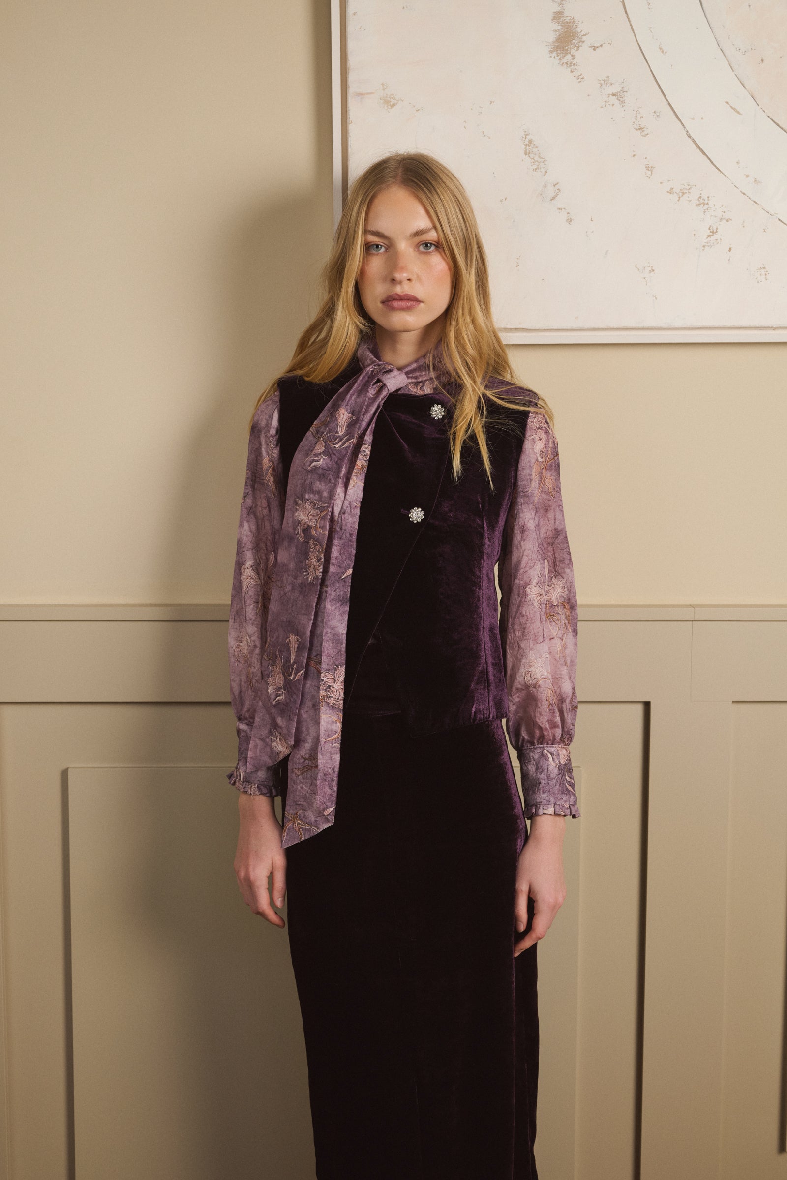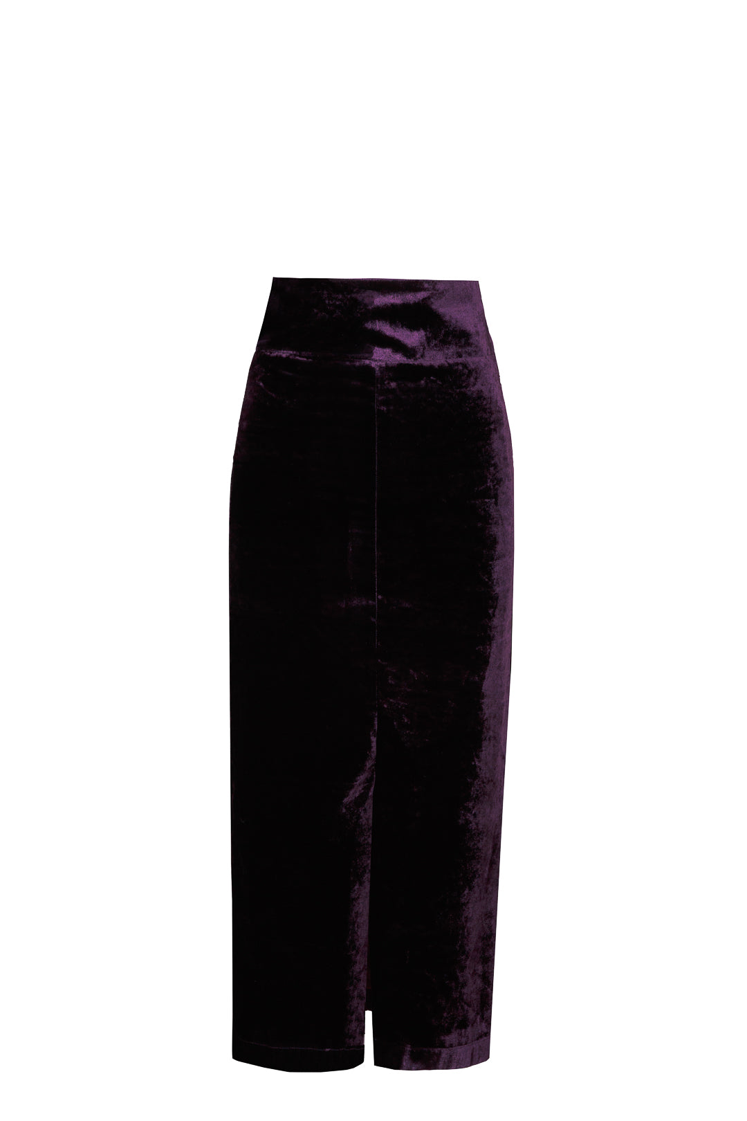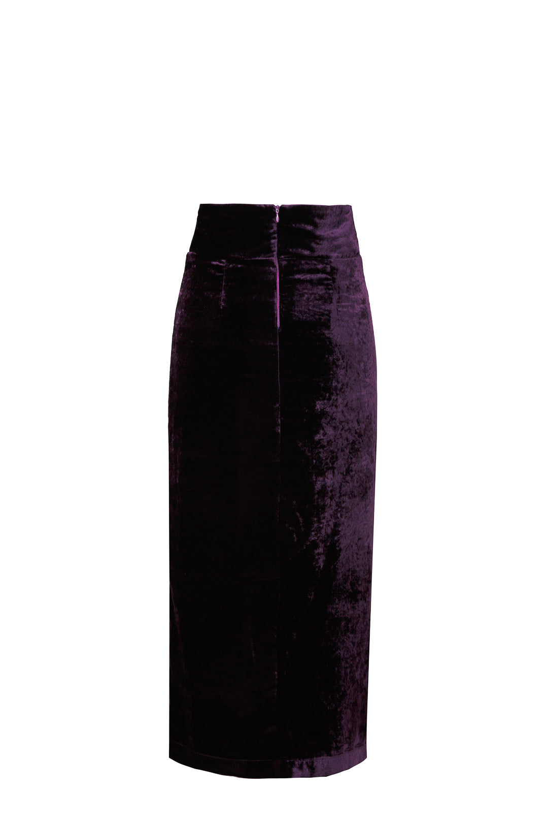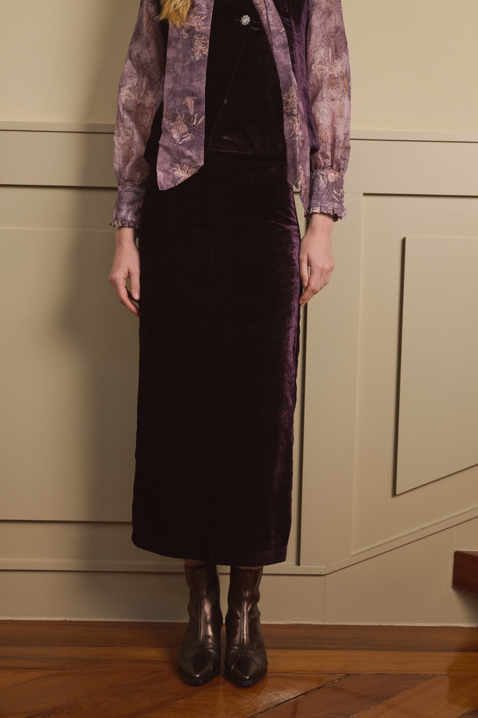 Falda confeccionada en terciopelo berenjena. Es recta con un ligero vuelo estilo evasé, con cinturilla ancha y con un corte terminado en una apertura delantera. Esta forrado en punto transpirable.