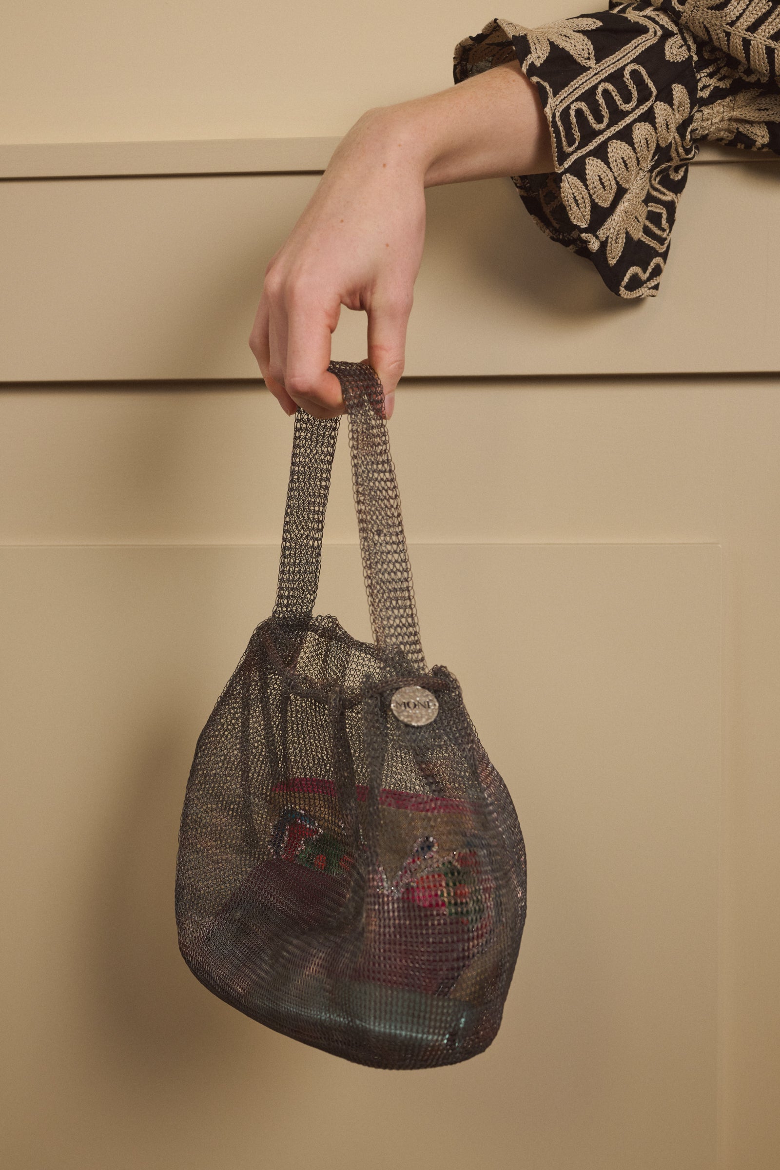 Bolso de la marca Moné tipo saquito fabricado artesanalmente en Bali con malla metálica ultra ligera, conocida por su efecto translúcido y su brillo único. Su forma flexible se adapta con elegancia, mientras que el acabado metalizado en tono cobre aporta un look sofisticado y moderno. Ideal para elevar cualquier outfit de noche o de evento.