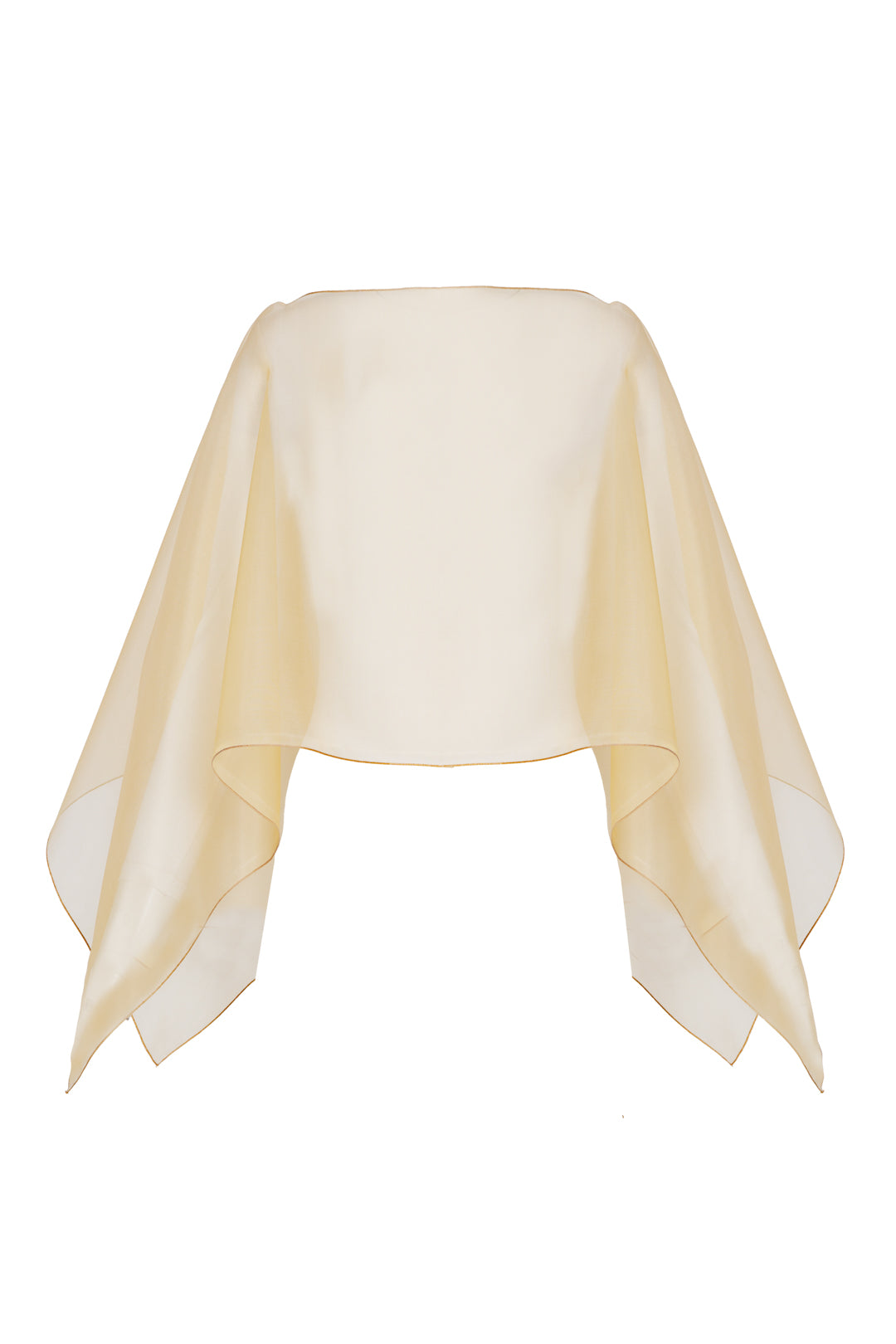 Capa confeccionada en organza de seda color champagne. Tiene mucha caída y movimiento. Es el accesorio perfecto para cualquier vestido. 100% SEDA