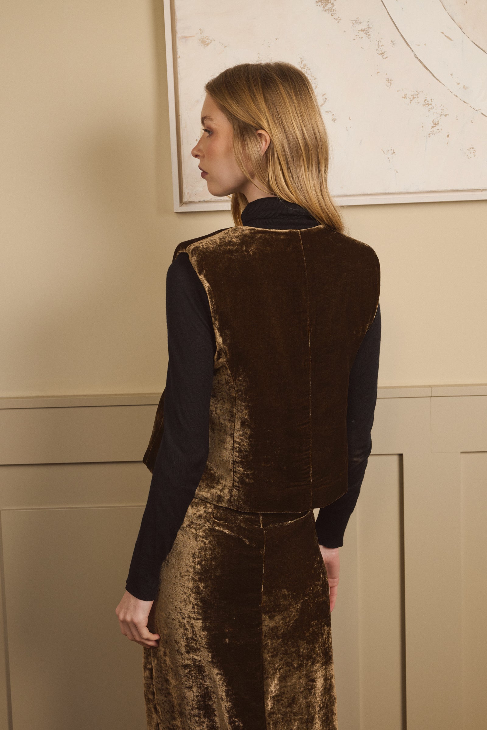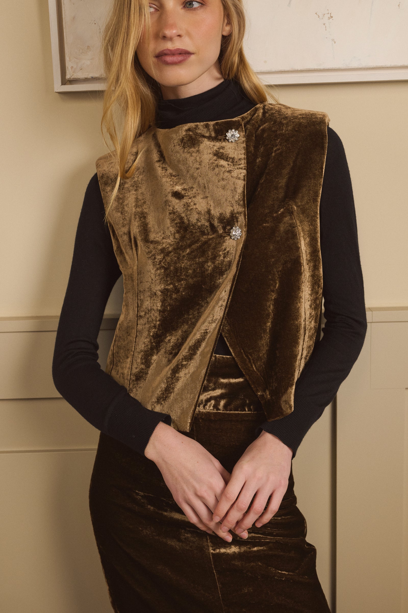 Chaleco confeccionado en terciopelo color topo. Va armado con hombreras y forrado en raso a tono. Se cierra con dos botones joya y puede llevarse también abierto. La modelo lleva talla S y mide 175.
