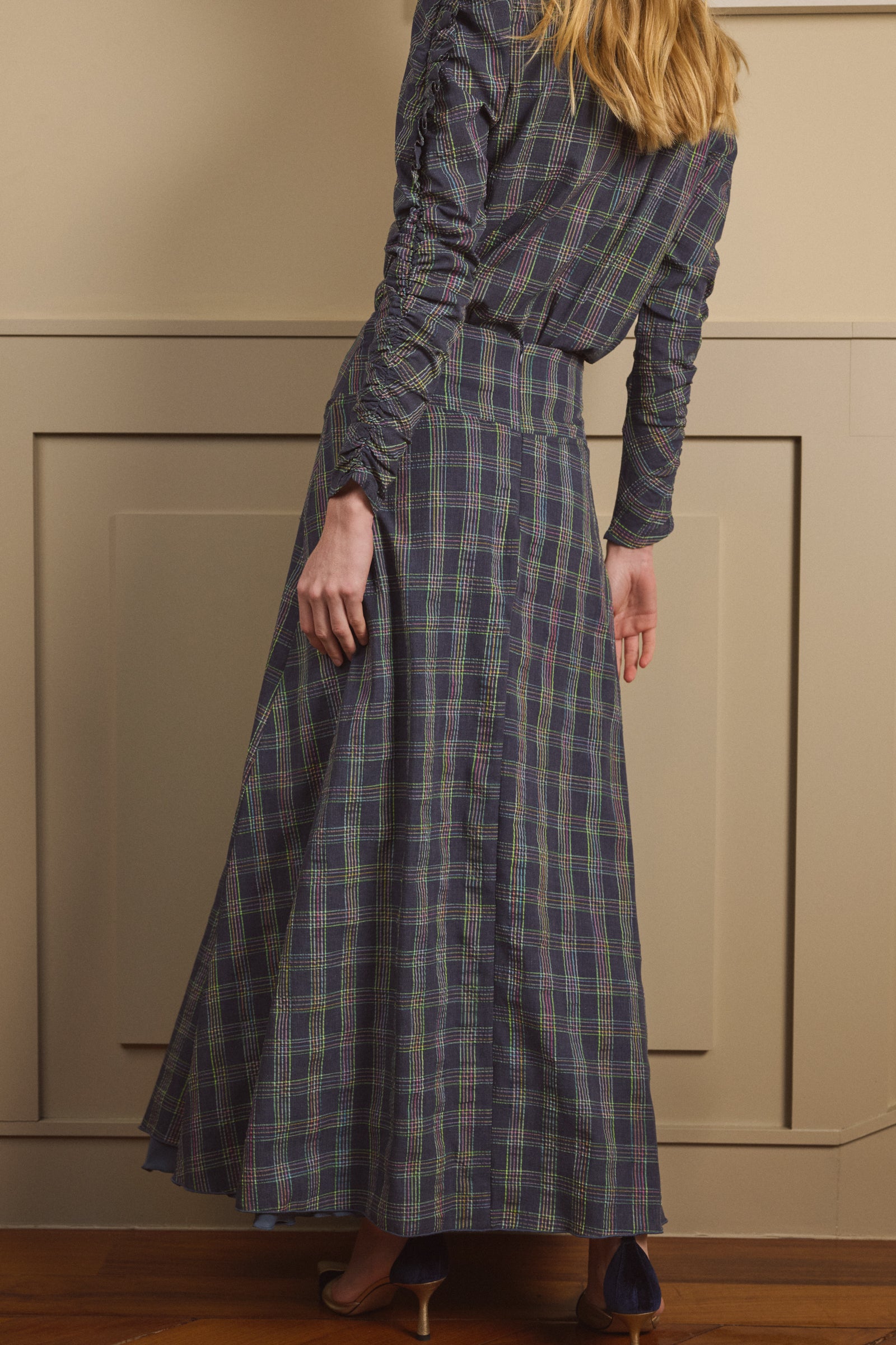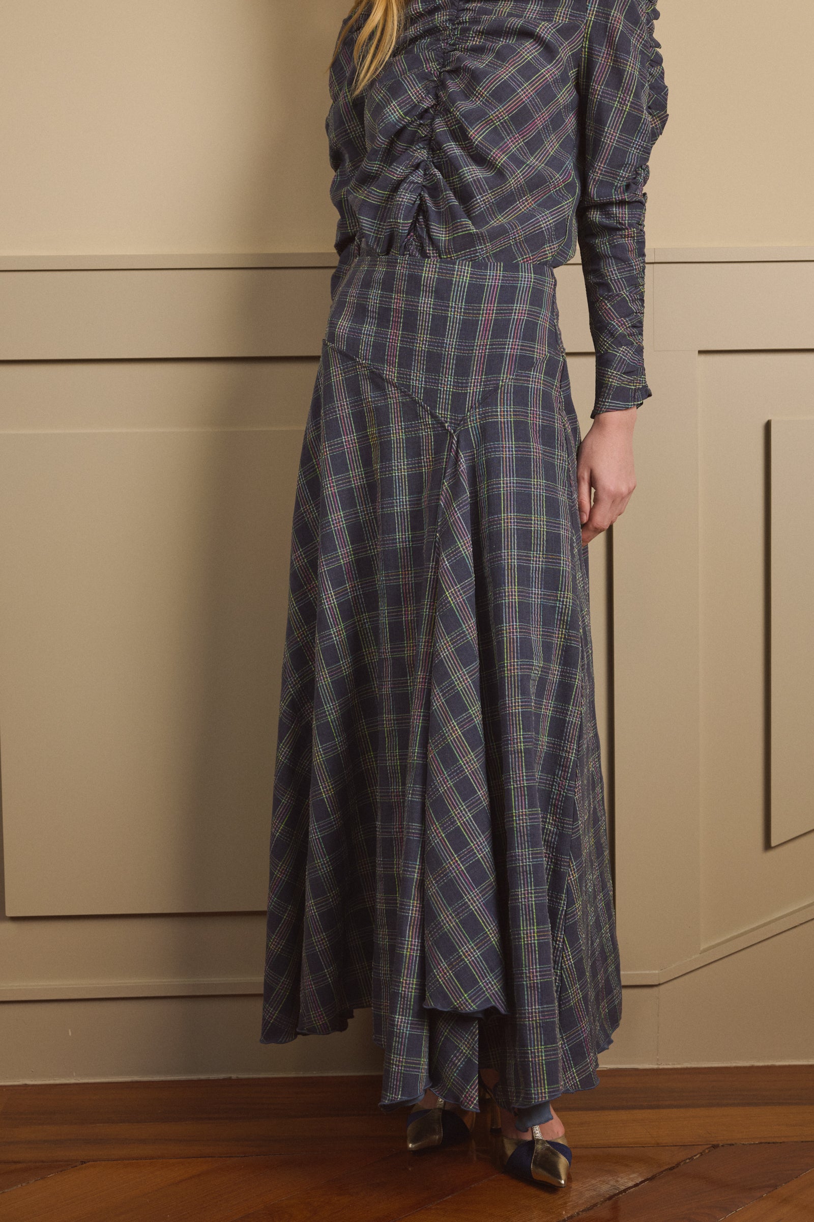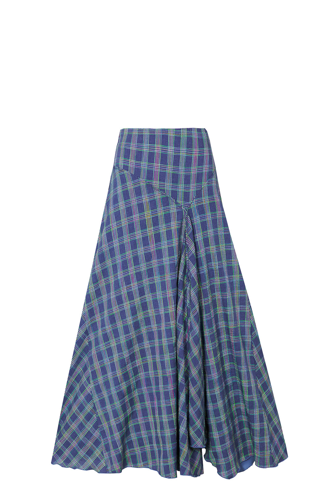 Falda midi confeccionada en algodón azul con cuadros amarillos y rosas. El diseño lleva corte al bies, lo que aporta mucho vuelo y movimiento. Lleva detalles de bies en las costuras, que estilizan la figura. Tiene abertura lateral y se cierra con cremallera central invisible en la espalda. Lleva forro a tono.