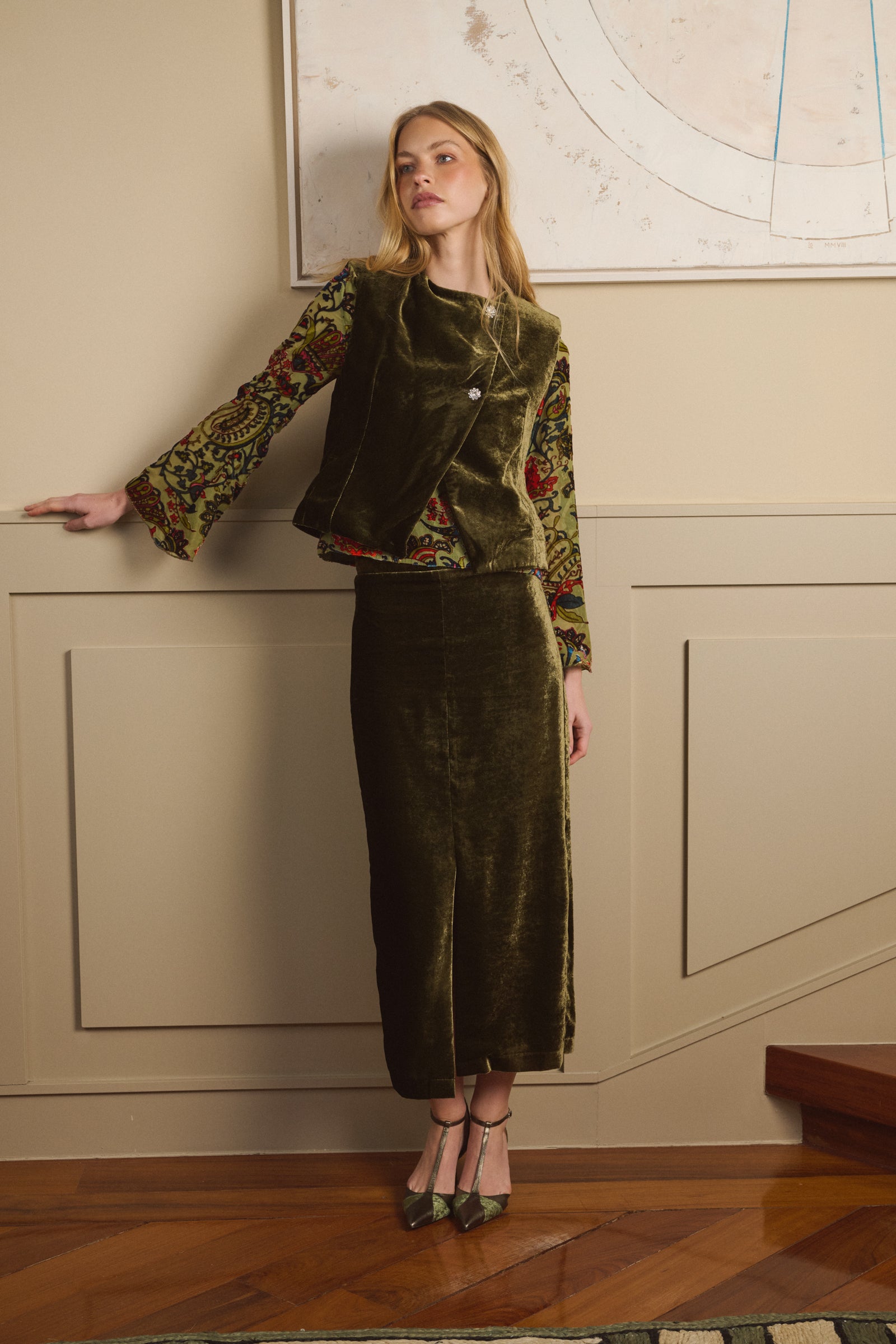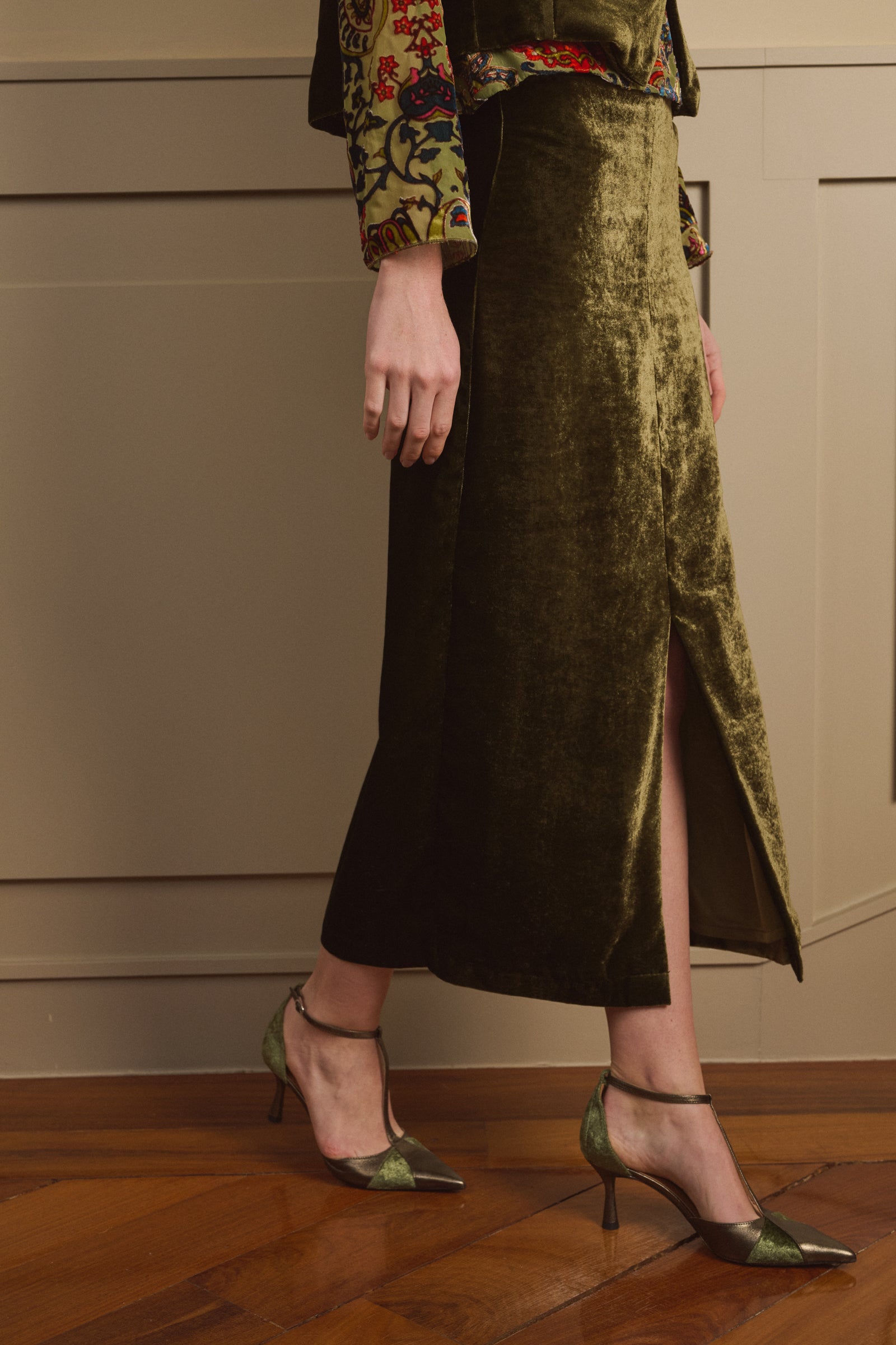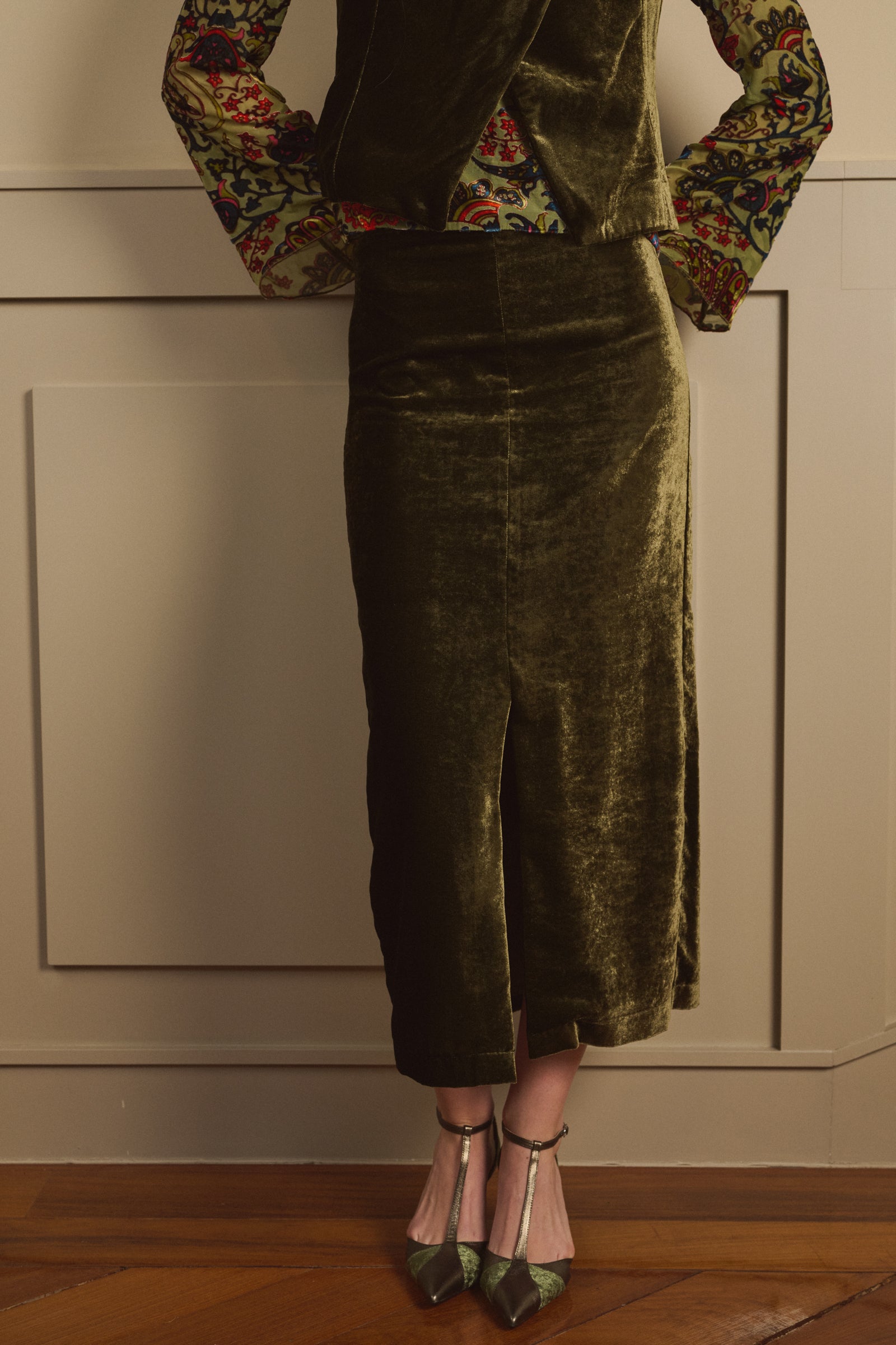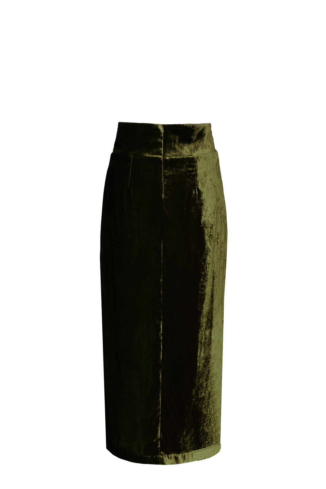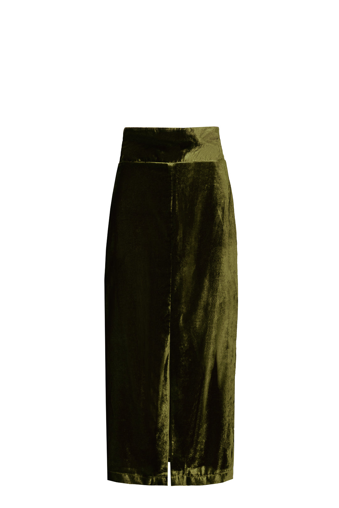 Falda confeccionada en terciopelo oliva. Es recta con un ligero vuelo estilo evasé, con cinturilla ancha y con un corte terminado en una apertura delantera. Esta forrado en punto transpirable.