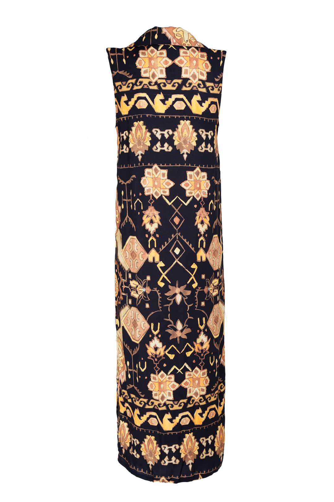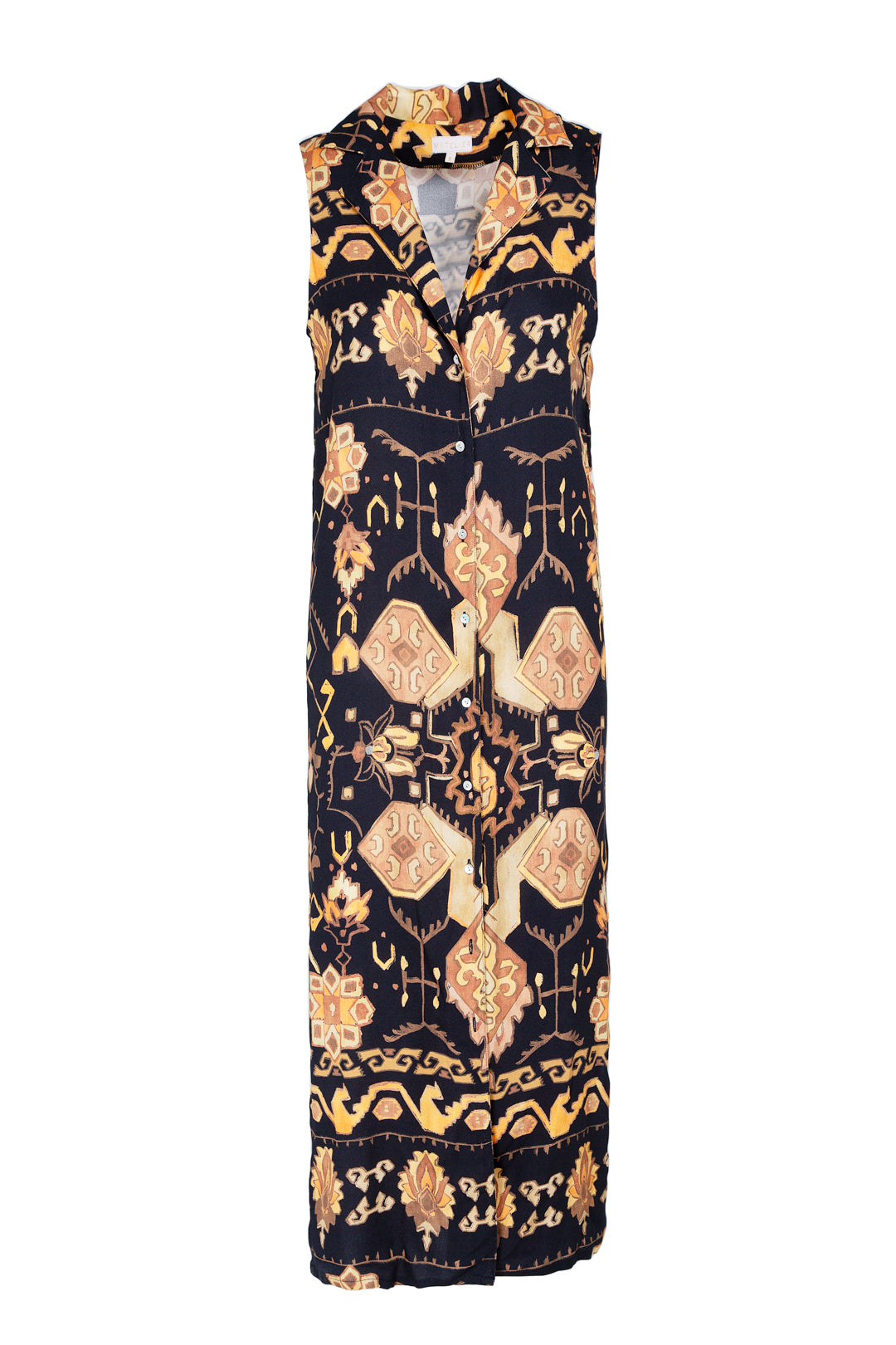 Vestido confeccionado en algodón estampado en tonos mostazas y negros. Es un diseño tipo chaleco con cuello de camisa y botones de nacar, de corte midi y sin mangas.