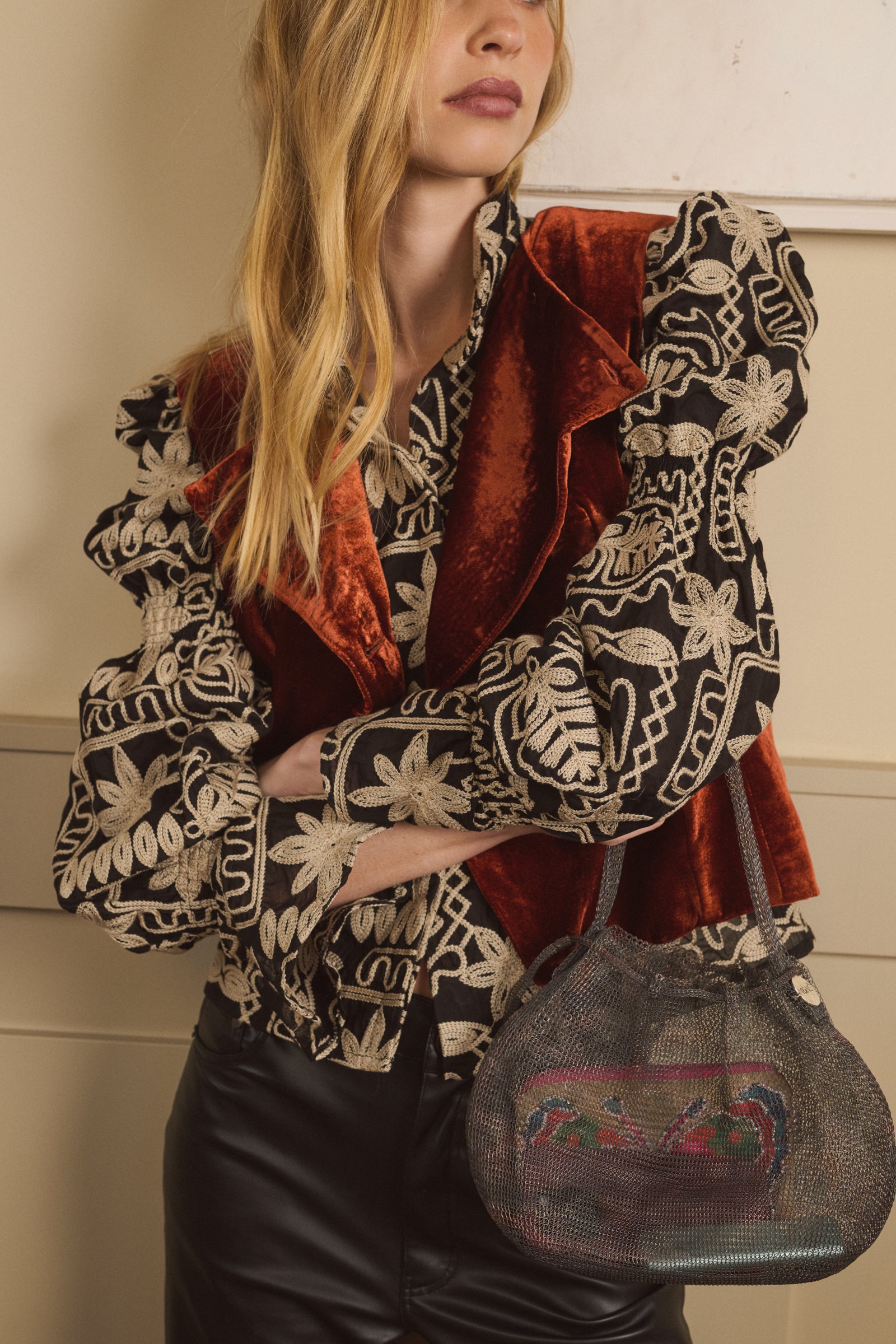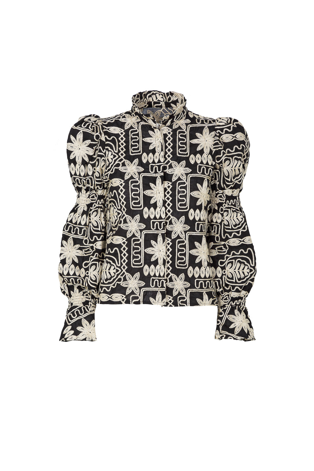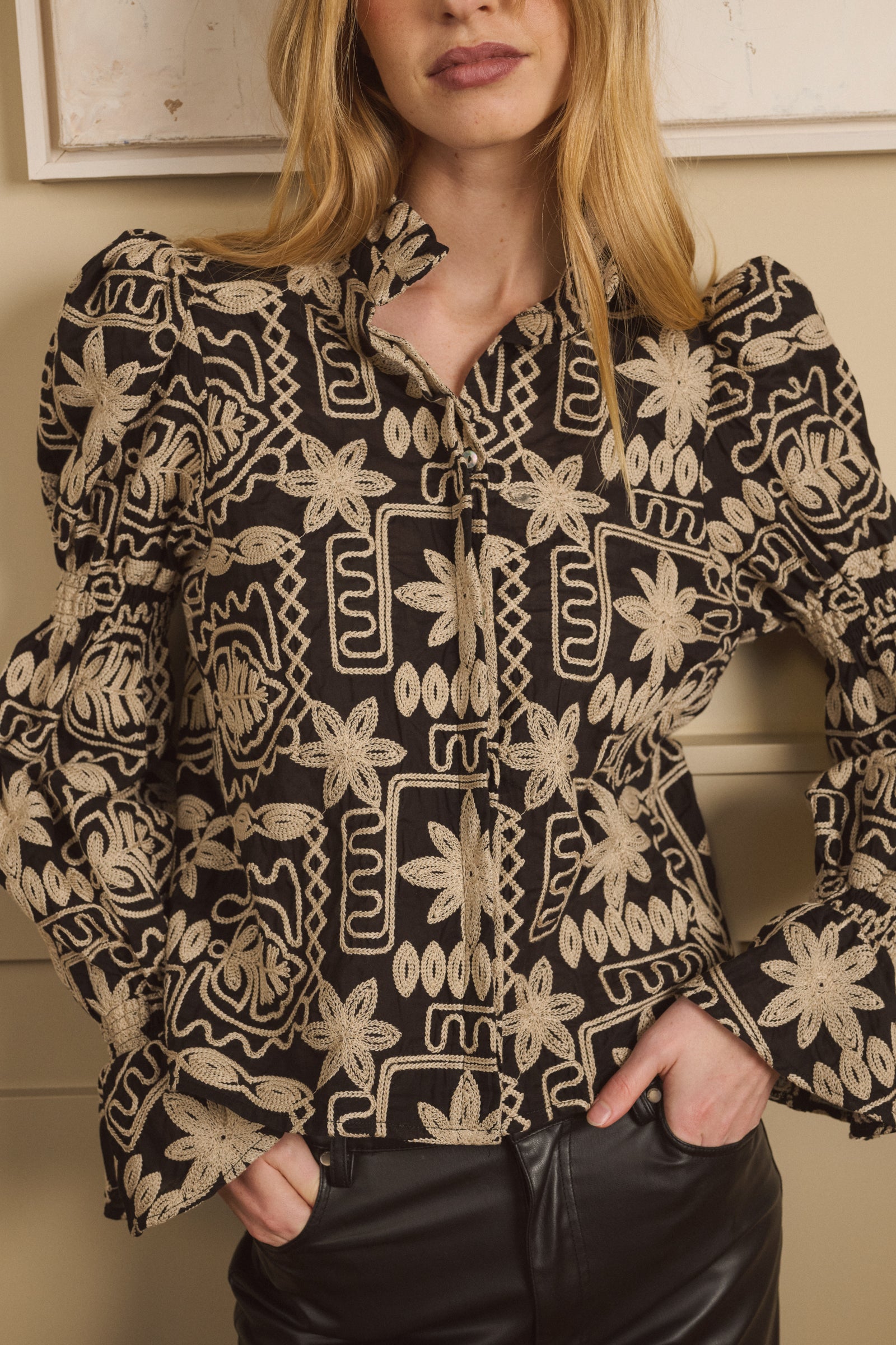 Blusa confeccionada en Algodón bordado. Esta blusa destaca por su elegante contraste entre el fondo negro y los delicados bordados en tonos claros, creando un diseño floral y geométrico lleno de personalidad. Sus mangas abullonadas aportan volumen y un toque sofisticado, mientras que el cuello con detalle fruncido añade un aire femenino y moderno. Confeccionada en un corte recto que favorece la silueta, es una prenda ideal para elevar cualquier outfit. Perfecta para combinar con su falda a juego y crear tu set ideal tanto para evento como para algo más casual o con pantalones de piel o looks más casuales, esta pieza se convierte en un imprescindible para quienes buscan estilo y distinción.