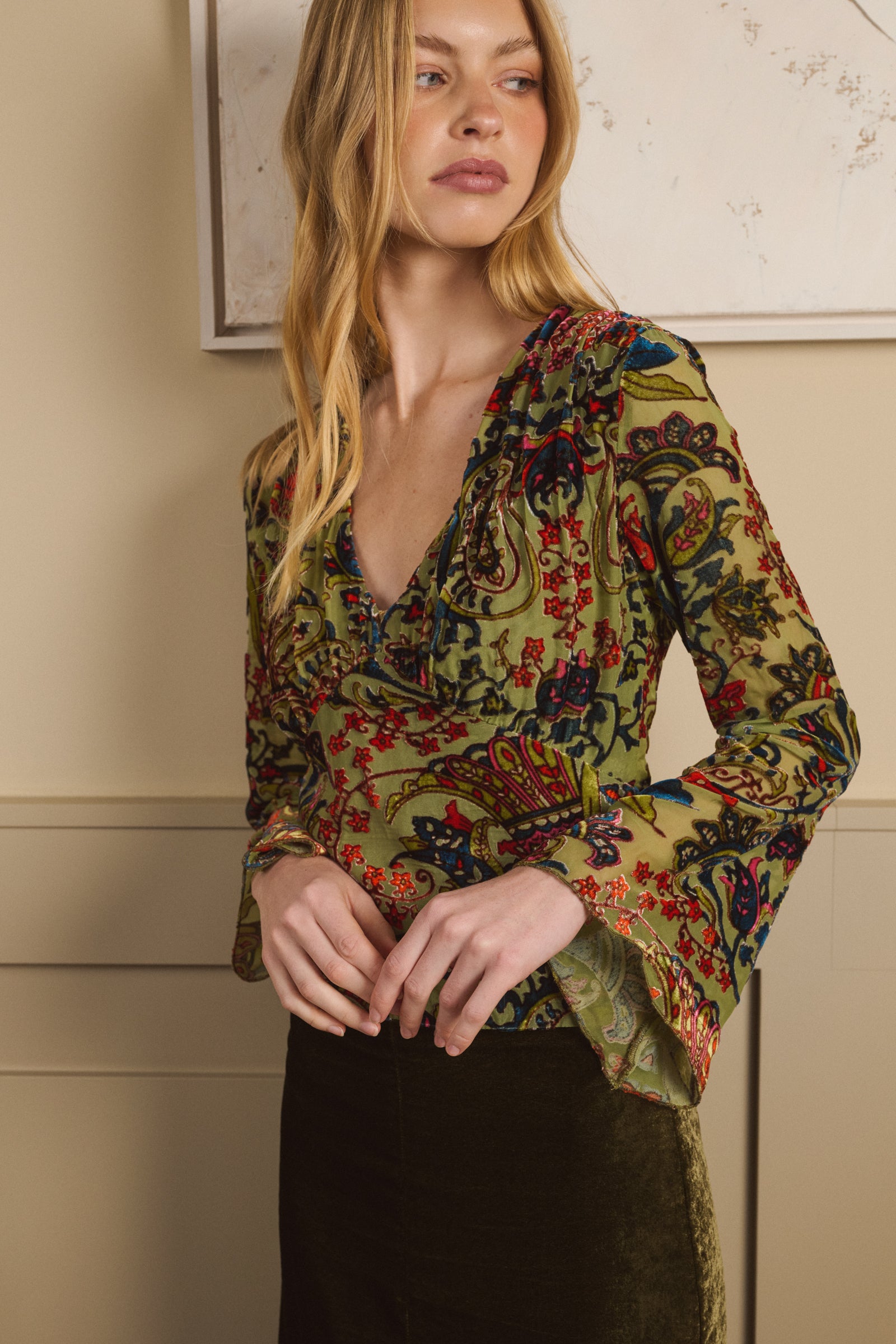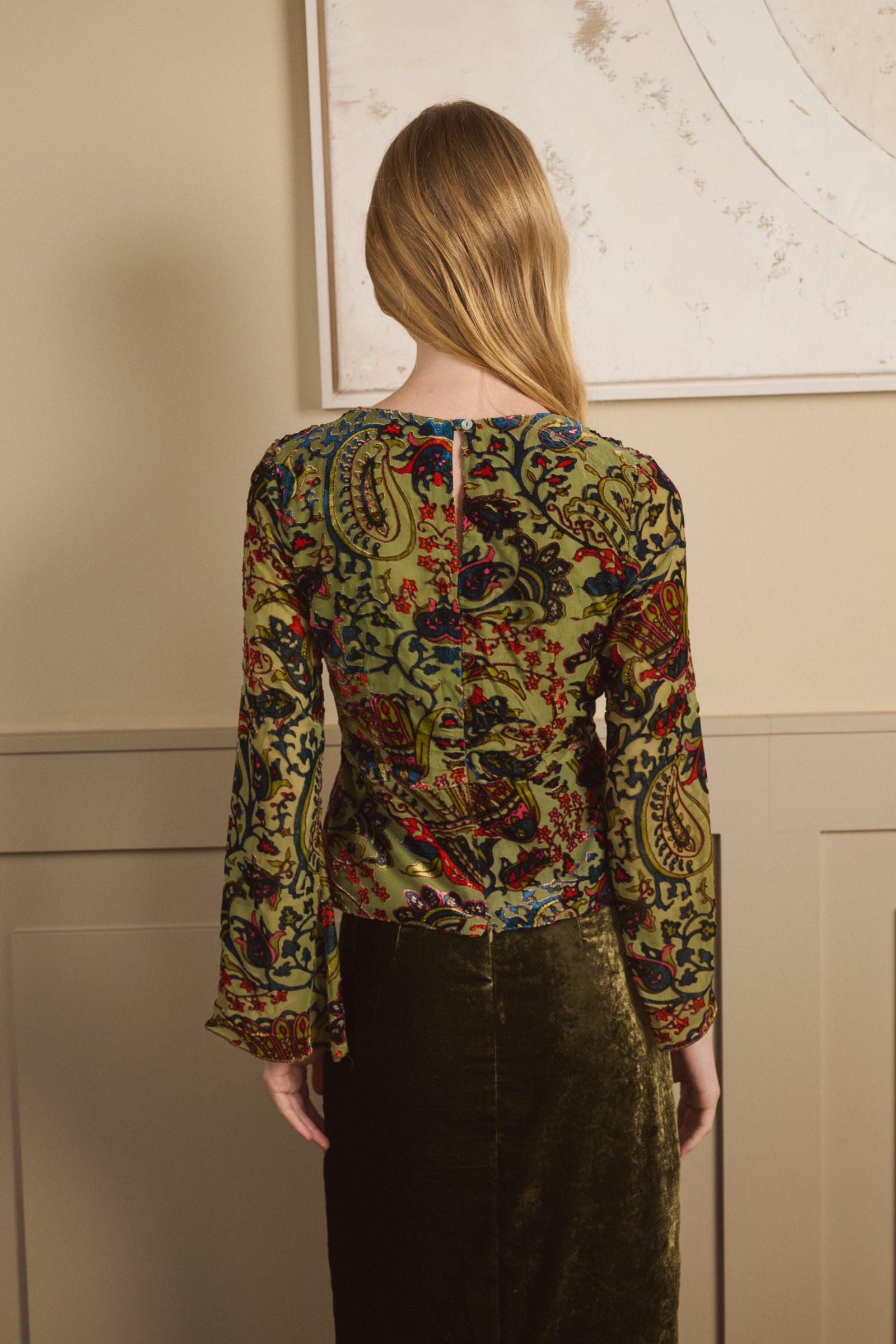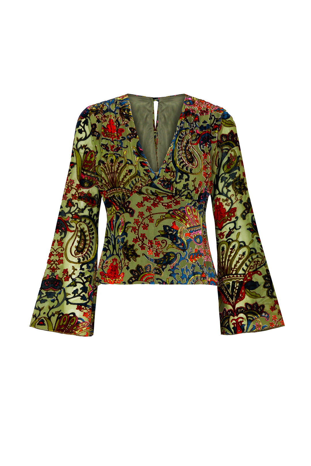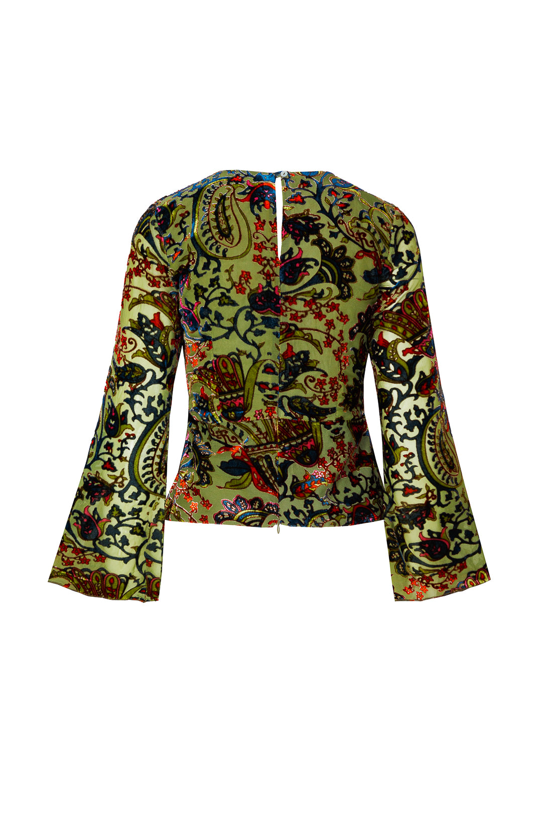 Blusa confeccionada en terciopelo estampado tonos verdes, rojos, azules y dorados, creando un look vibrante y elegante.
