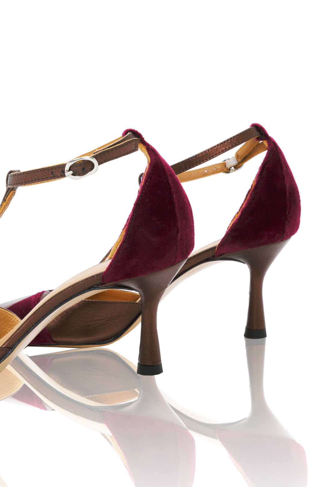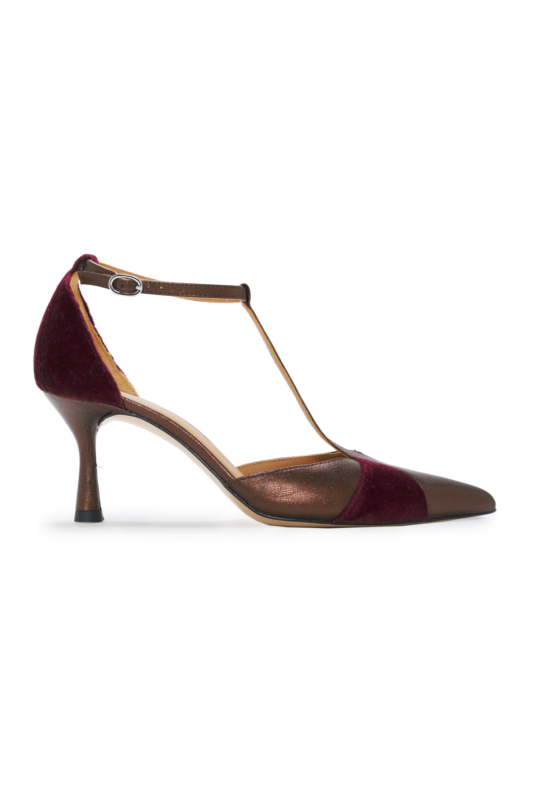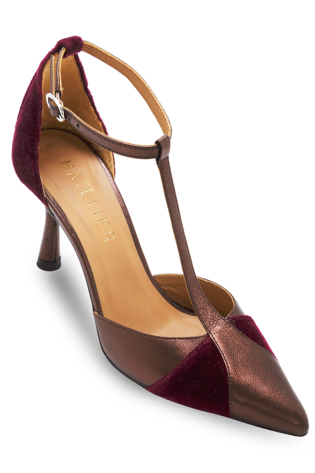 Salón de fiesta, producido artesanalmente en piel de alta calidad y materiales elegidos al detalle. El color es un burdeos viejo con un toque metalizado único, combinado con terciopelo vino. El diseño de la puntera, dividido por 3 costuras, sumado a la tira central vertical que llega a la pulsera del tobillo, estiliza la silueta, estrecha la forma del pie y alarga la pierna, creando un efecto muy elegante y sofisticado. El tacón tiene una altura de 7,5 cm.