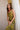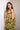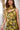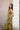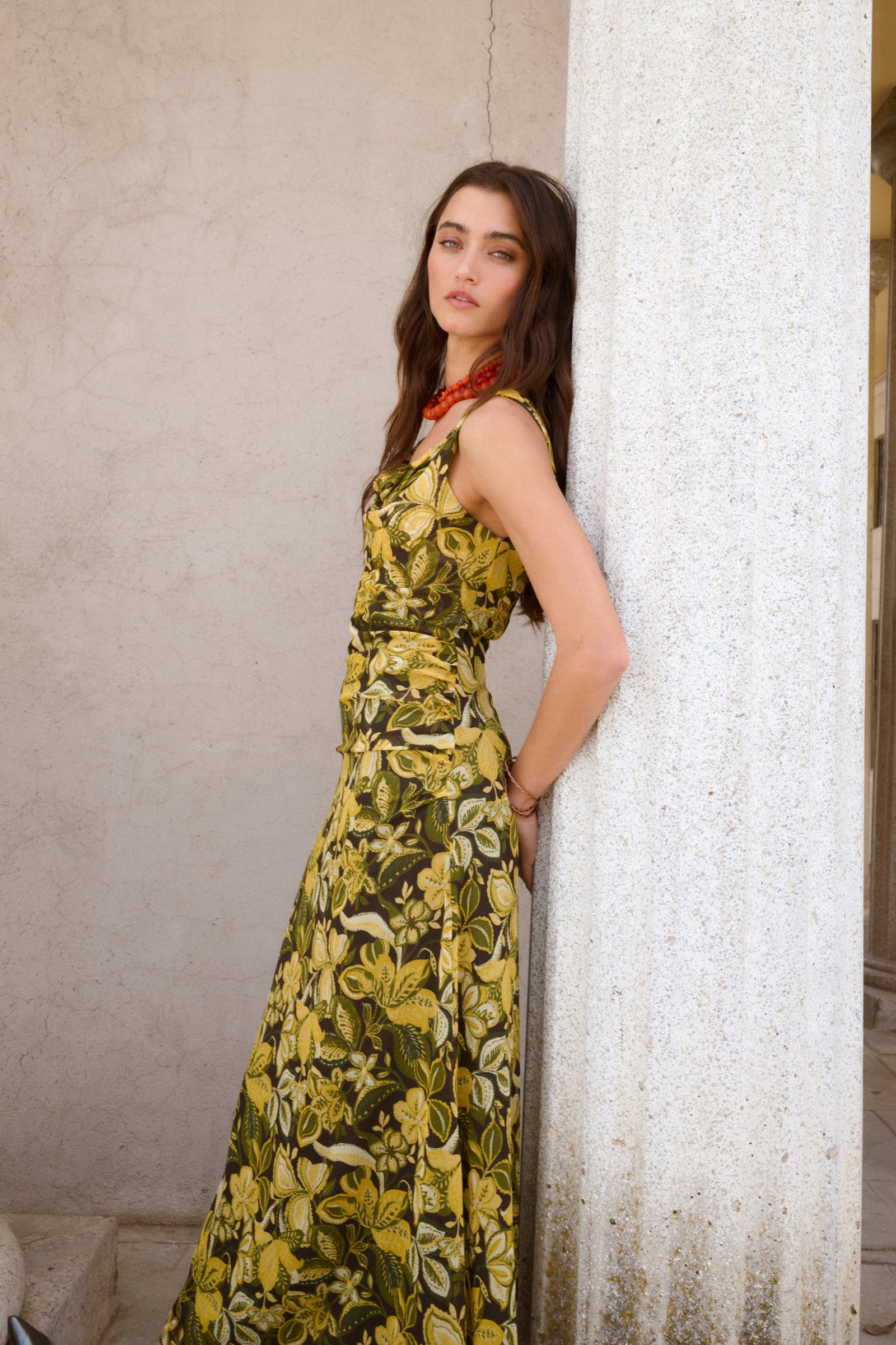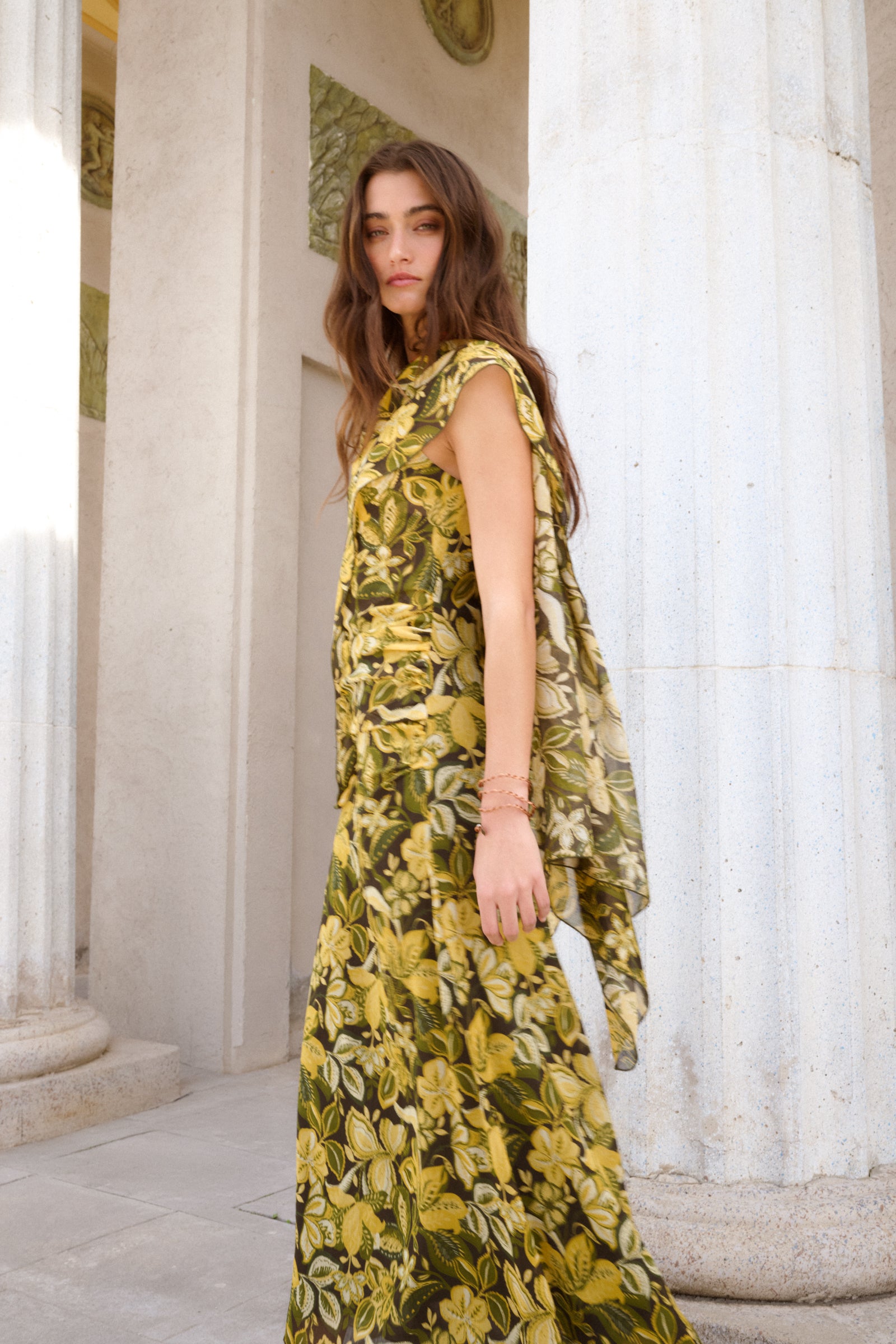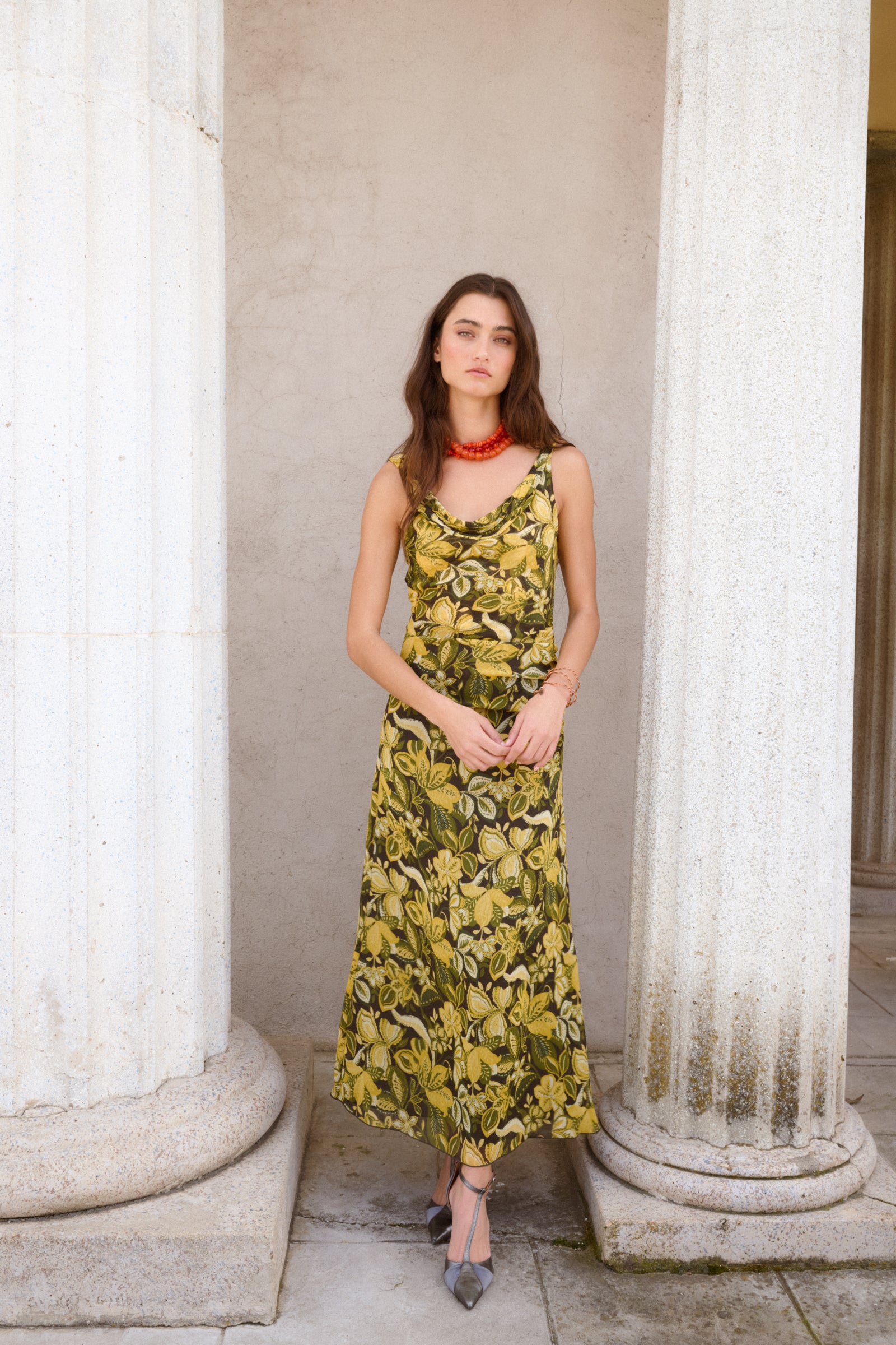 Vestido confeccionado en gasa estampada en tonos verdes y lima. El vestido tiene corte midi, lleva tirantes drapeadas y escote en cascada y la espalda ligeramente abierta en pico. Lleva fruncido en los laterales del vestido y falda recta. Se cierra en la espalda con cremallera invisible y va forrado en punto transpirable.
