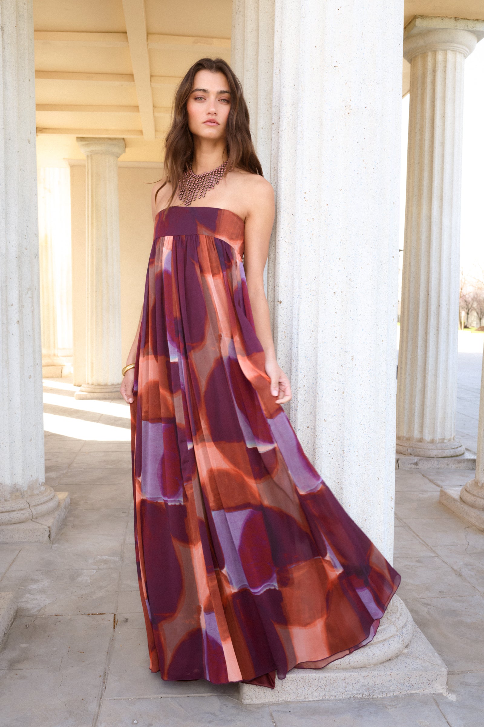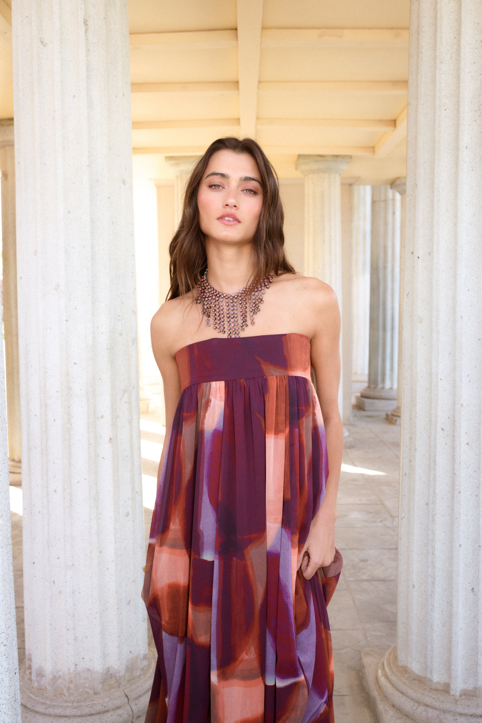 Vestido confeccionado en gasa estampada en tonos morados. El vestido esta compuesto por un escote palabra de honor con un corte largo casi hasta el suelo. El vestido tiene mucho vuelo porque la falda nace de escote imperio con un ligero frunce.