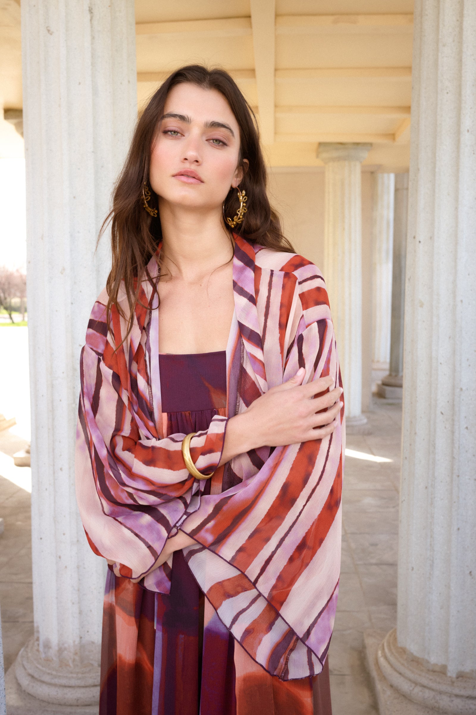 Lleva a juego una chaqueta estilo kimono de gasa con los tonos del vestido con rayas horizontales.