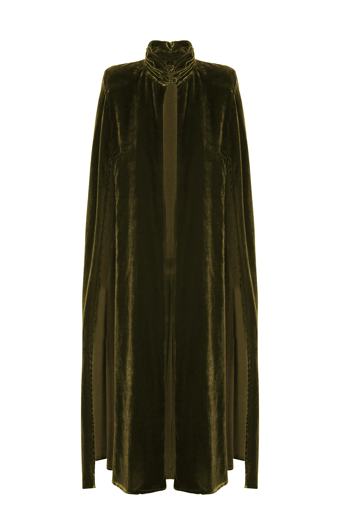 Capa confeccionada en terciopelo de seda color verde oliva. Lleva hombreras, cuello drapeado y no tiene sisa, sino dos aberturas por donde sacar los brazos. Puede llevarse abierta o cerrada en el cuello con botones. El largo de la capa desde el hombro es de 125cm