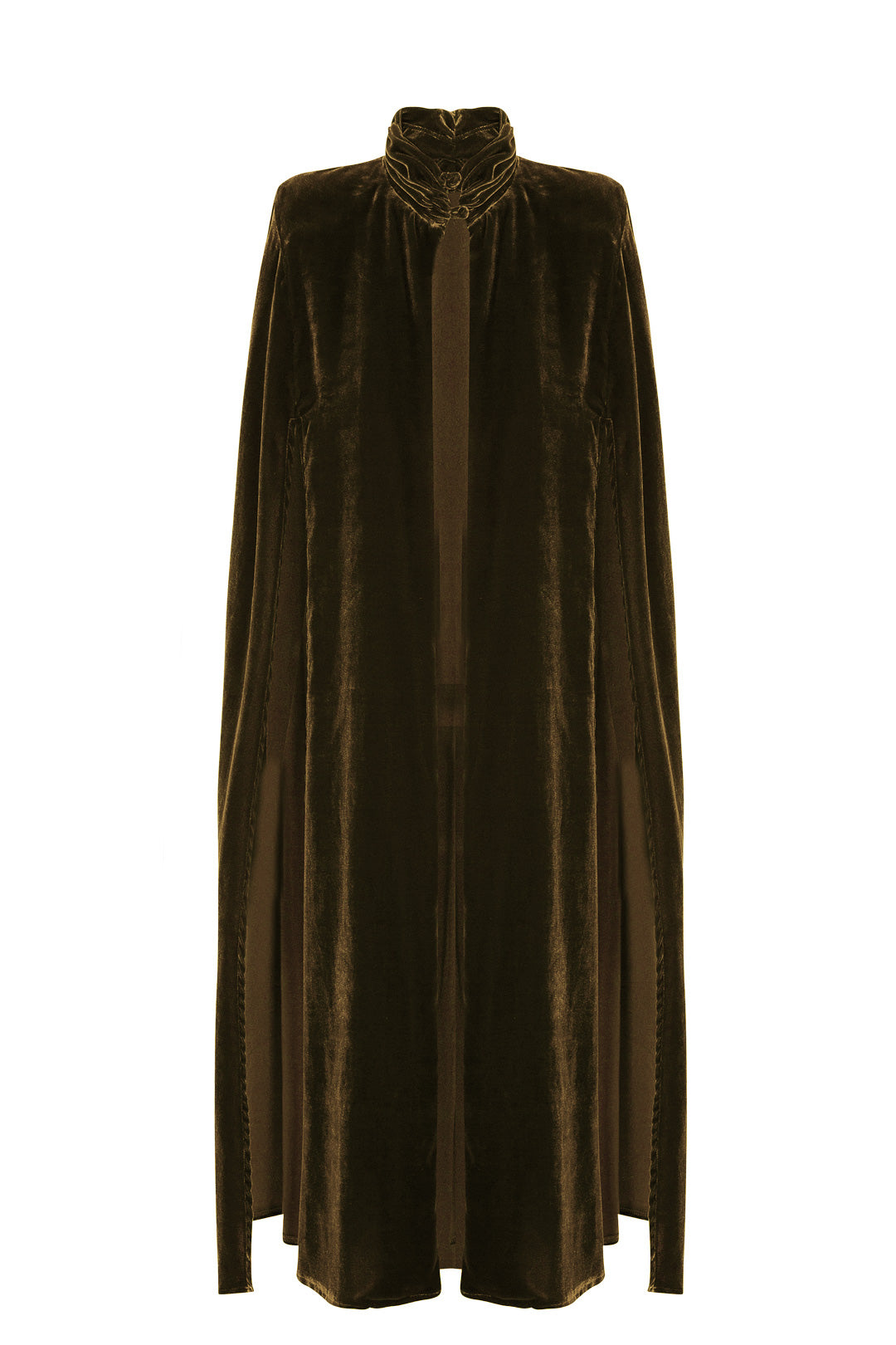 Cape made of bronze silk velvet. It features shoulder pads, a draped collar, and no armholes, but two openings for arm extensions. It can be worn open or buttoned at the neck. The cape is 125 cm long from the shoulder.