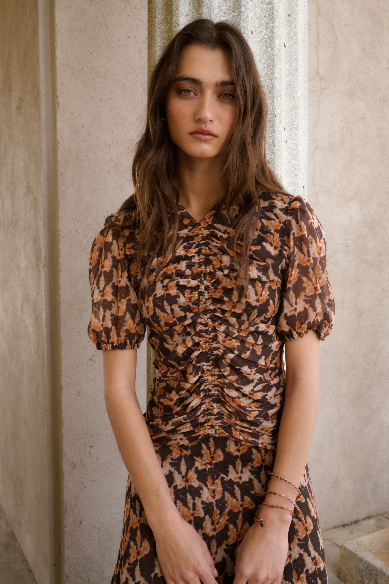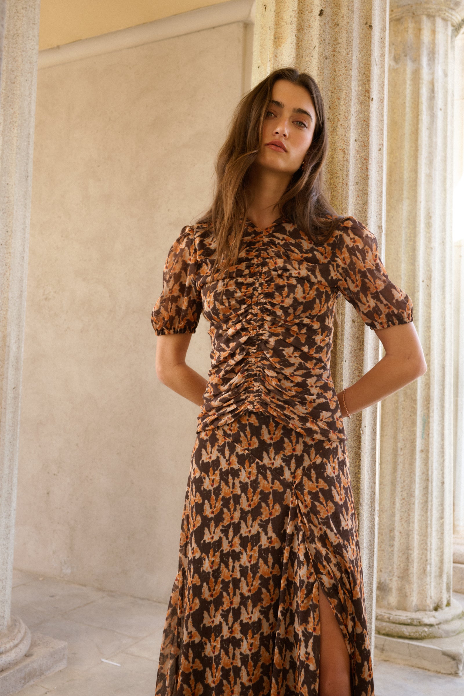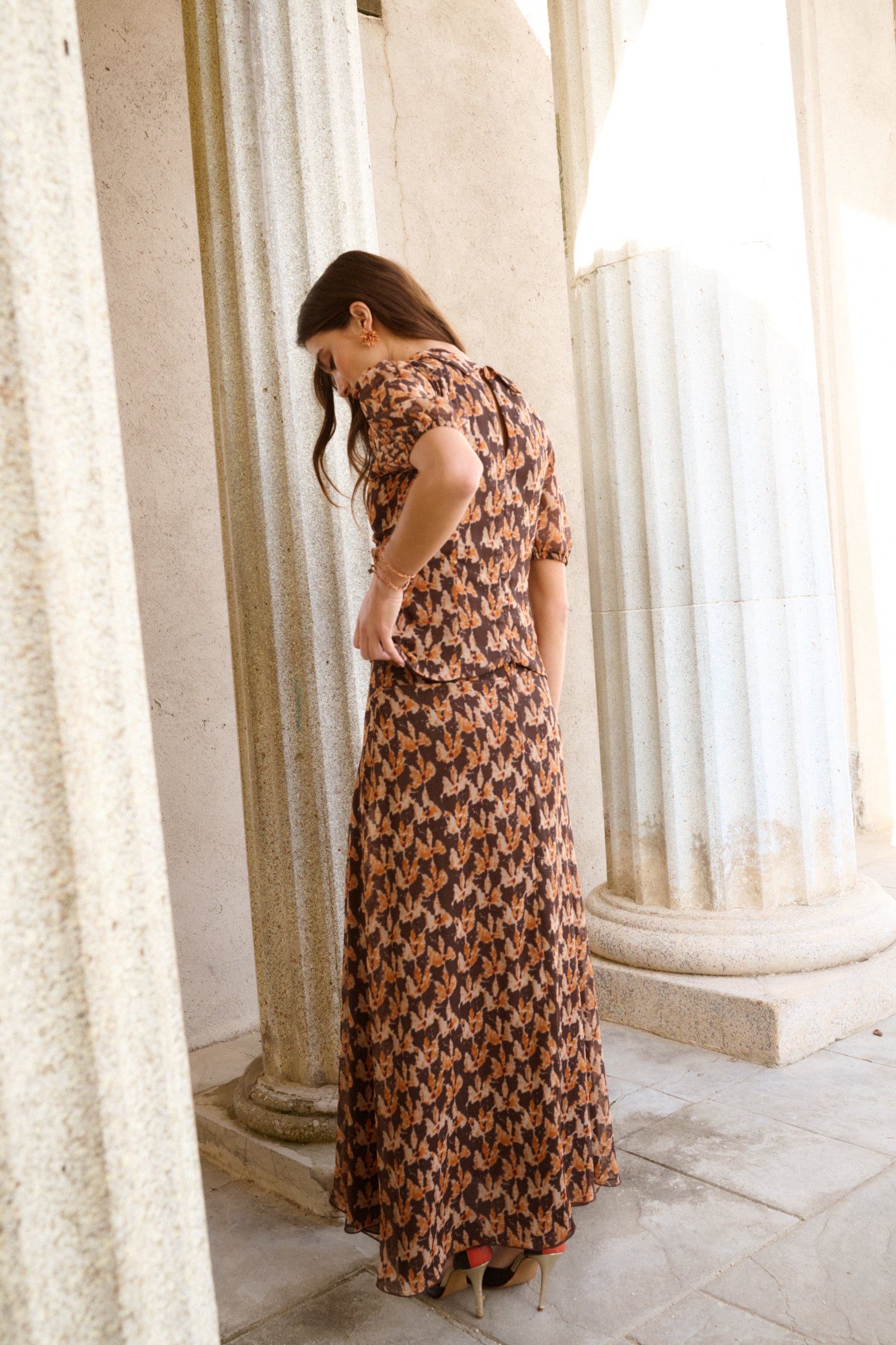 Total look confeccionado en gasa estampada en tonos pardos y mostazas. El top es de cuello redondo con solapas y va fruncido en la parte central del top. Las mangas son cortas y ligeramente abullonadas . Se cierra con botón en la espalda y con una cremallera invisible. La Falda es midi y lleva corte al bies, lo que aporta mucho vuelo y movimiento. Lleva detalles de bies en las costuras, que estilizan la figura. Tiene abertura lateral.
