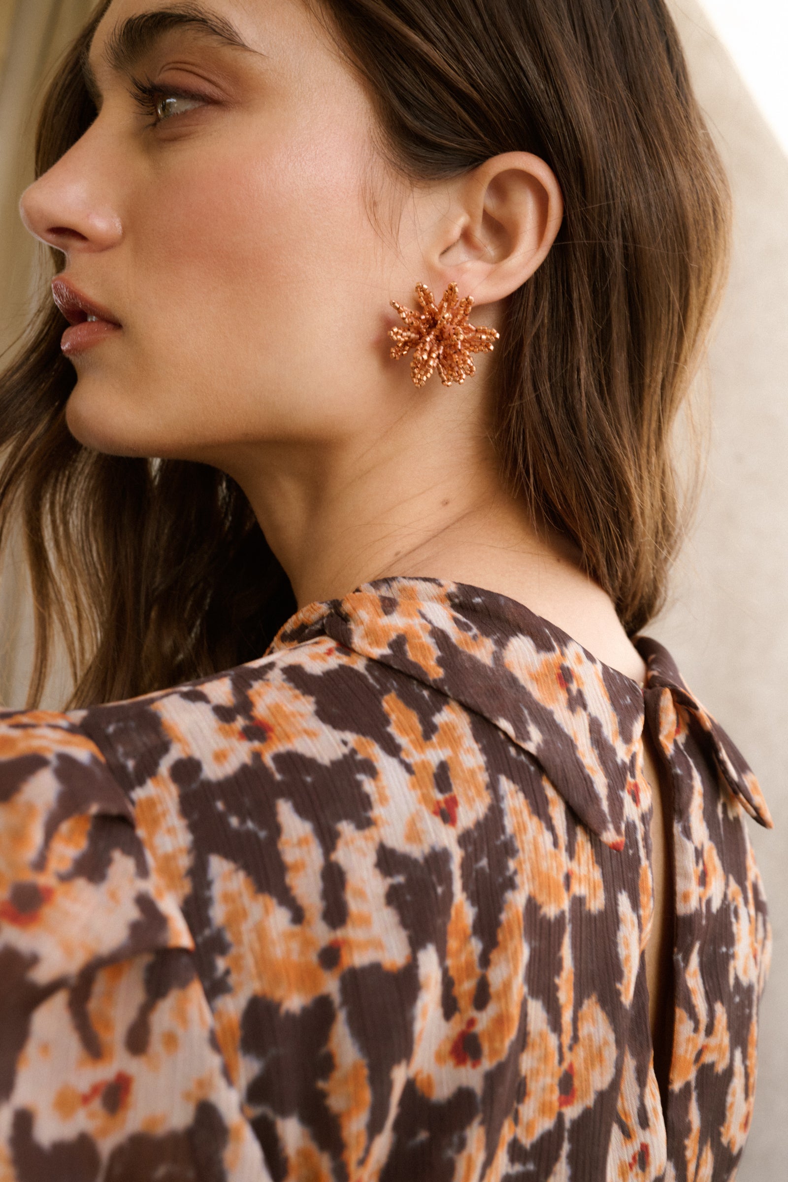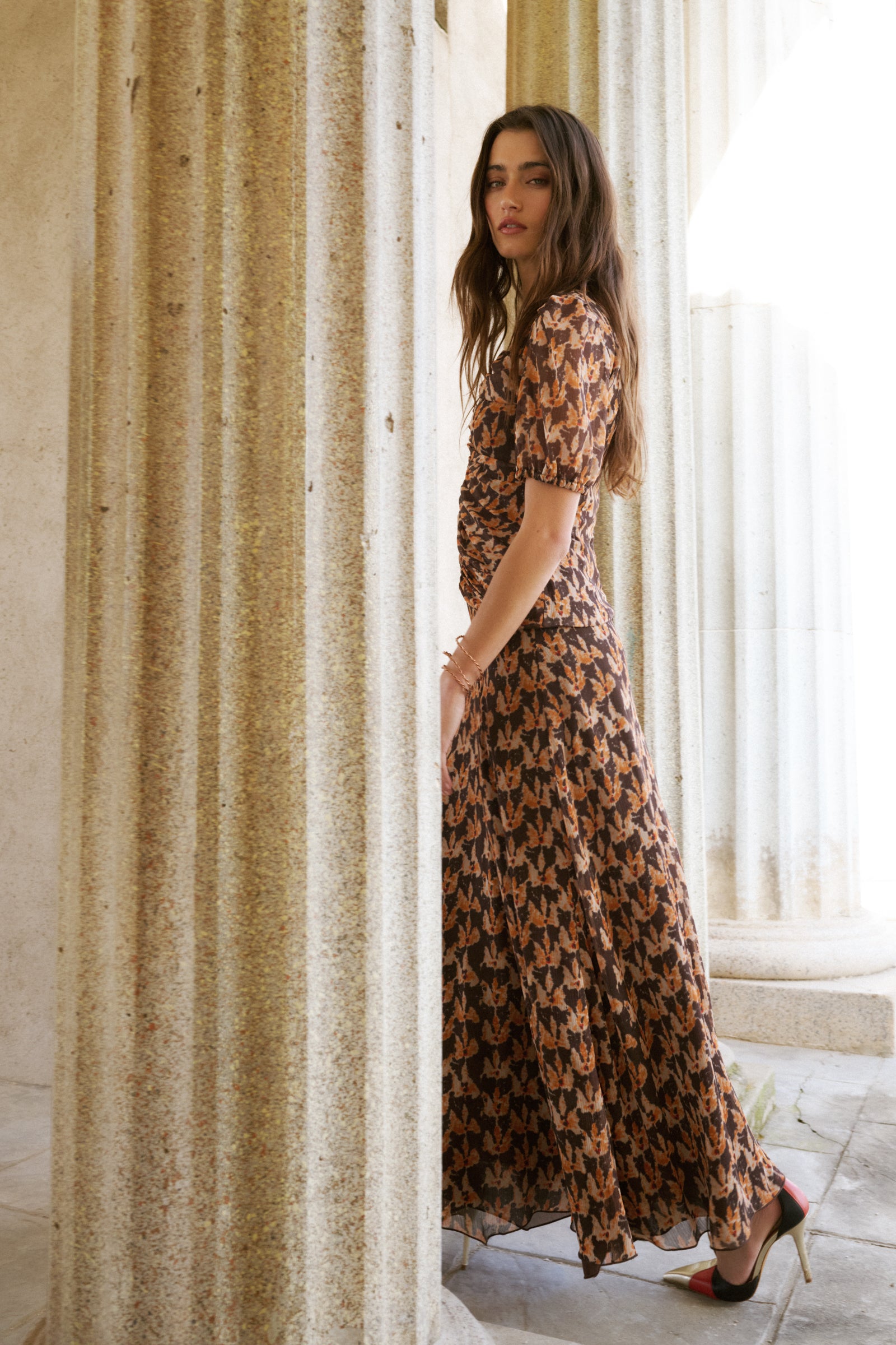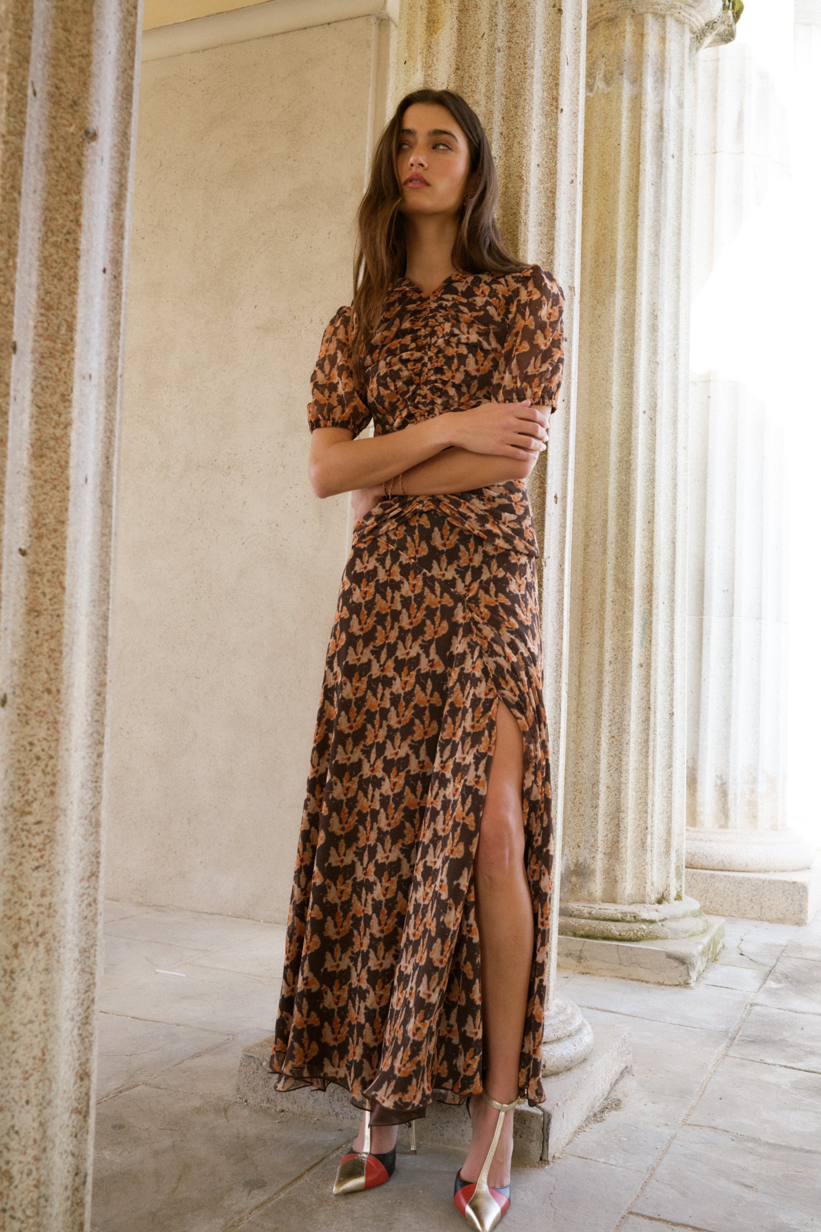 Total look confeccionado en gasa estampada en tonos pardos y mostazas. El top es de cuello redondo con solapas y va fruncido en la parte central del top. Las mangas son cortas y ligeramente abullonadas . Se cierra con botón en la espalda y con una cremallera invisible. La Falda es midi y lleva corte al bies, lo que aporta mucho vuelo y movimiento. Lleva detalles de bies en las costuras, que estilizan la figura. Tiene abertura lateral.