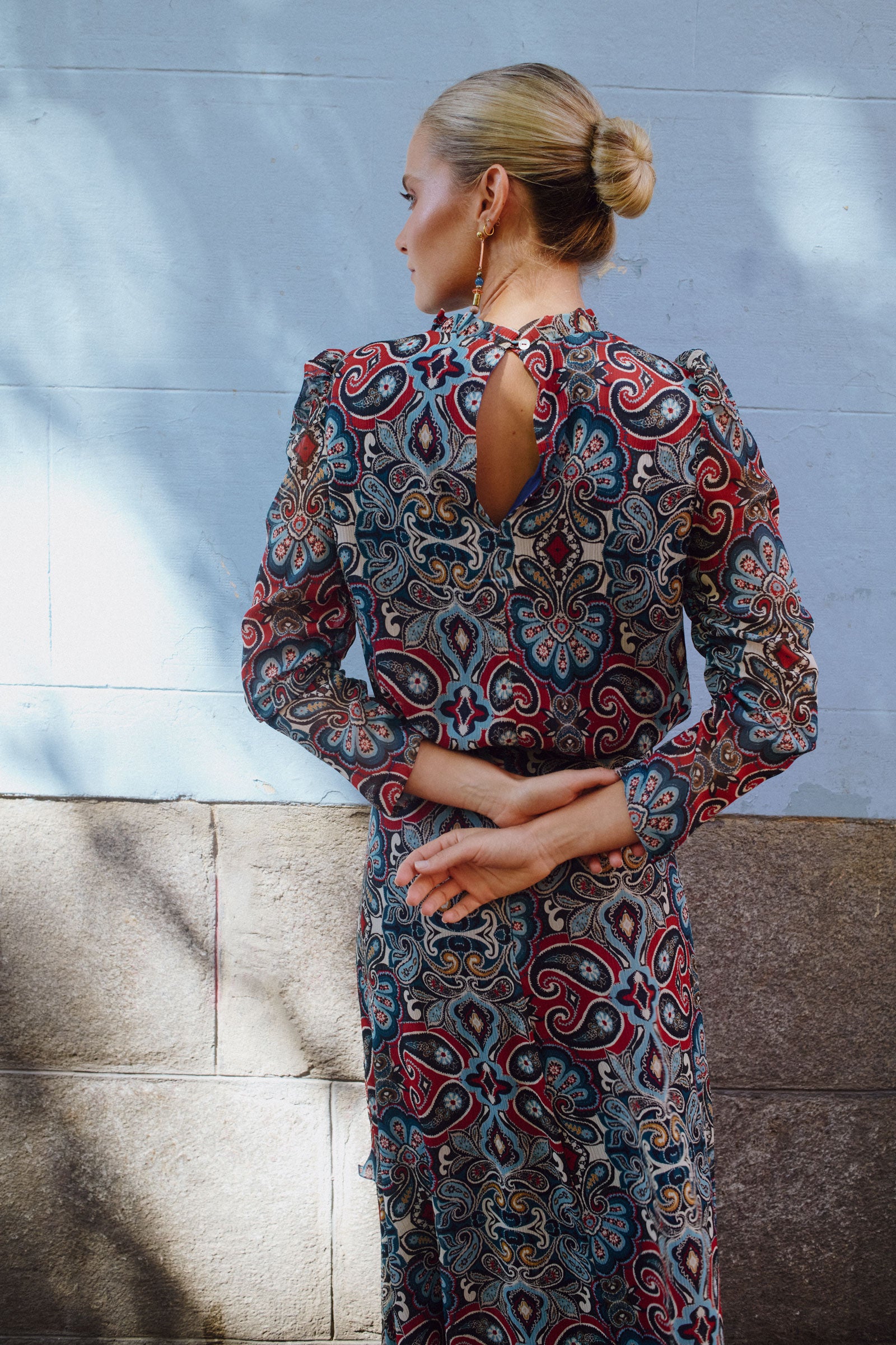 Total look de dos piezas, compuesto por gasa estampada en tonos azules y granates.
