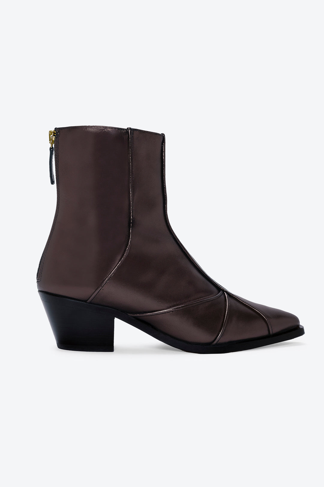 Elegantes y modernas, estas botas metalizadas con acabado en tono berenjena piel auténtica combinan acabados lisos con costuras visibles en en la punta, laterales y talón que remarcan el acabado del botín aportando un diseño único y sofisticado.